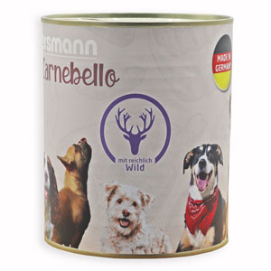 Our Eggersmann Carnebello with Venison is a high-quality wet dog food for canine connoisseurs. The high amount of premium-quality venison meat gives it a firm, meaty texture. It is packed with nutrients as well as being low in fat. The juicy muscle meat, combined with salmon oil and valuable omega-3 fatty acids provides your dog with all the nutrients it needs. Because of the particularly gentle cooking process, all the important vitamins, trace elements and minerals are retained in this complete dog food. As it is completely free from grains, sugar and artificial colours and flavours, our wet dog food provides your dog with both a tasty and nutritious meal. Our Eggersmann Carnebello with Venison is suitable as a complete feed for adult dogs but can also be mixed with dry feed if preferred.